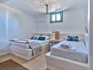 Ascending to the first floor, guests will discover two single-bed bedrooms adorned with an en-suite bathroom and a private balcony, offering sweeping and uninterrupted views of the endless Aegean expanse. In the main house's basement, our guests will discover a bedroom furnished with two single beds and one double bed.